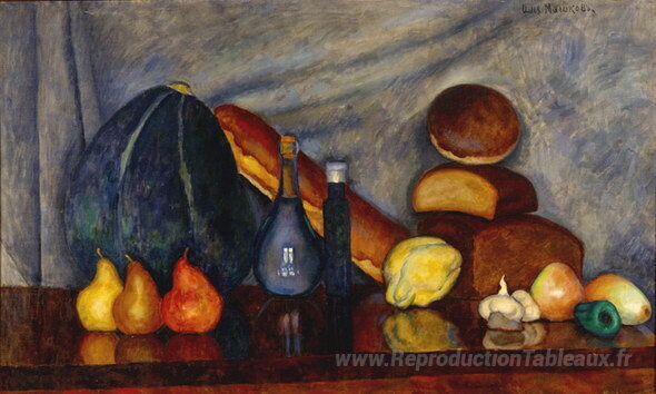 Nous vous proposons une reproduction artisanale sur toile du célèbre tableau 'Nature morte avec du pain et de la citrouille' de Ilya Mashkov, provenant du Musée de la Reproduction.