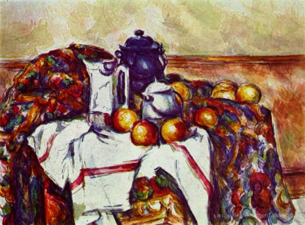 Nous vous proposons une reproduction artisanale sur toile du célèbre tableau 'Nature morte avec du pot bleu' de Paul Cezanne, provenant du Musée de la Reproduction.