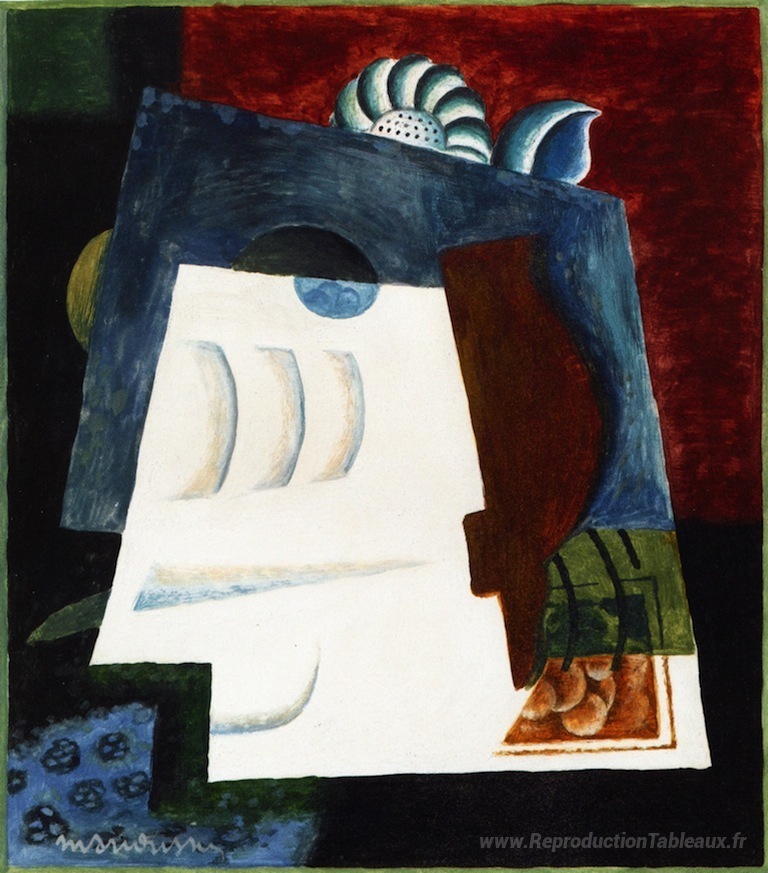 Nous vous proposons une reproduction artisanale sur toile du célèbre tableau 'Nature morte avec enveloppe' de Louis Marcoussis, provenant du Musée de la Reproduction.
