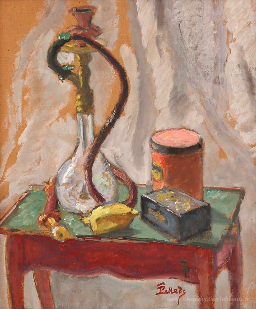 Nous vous proposons une reproduction artisanale sur toile du célèbre tableau 'Nature morte avec Hubble-bubble et boîtes' de Theodor Pallady, provenant du Musée de la Reproduction.