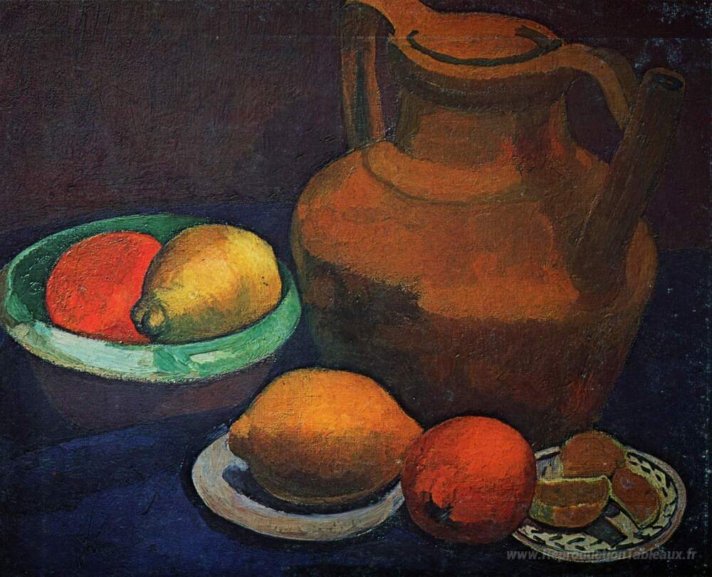 Nous vous proposons une reproduction artisanale sur toile du célèbre tableau 'Nature morte avec Jug' de Paula Modersohn-Becker, provenant du Musée de la Reproduction.