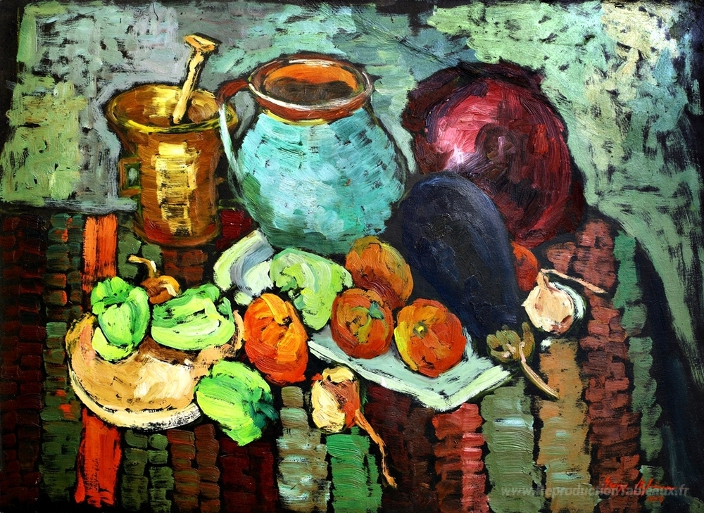 Nous vous proposons une reproduction artisanale sur toile du célèbre tableau 'Nature morte avec légumes' de George Stefanescu-Ramnic , provenant du Musée de la Reproduction.