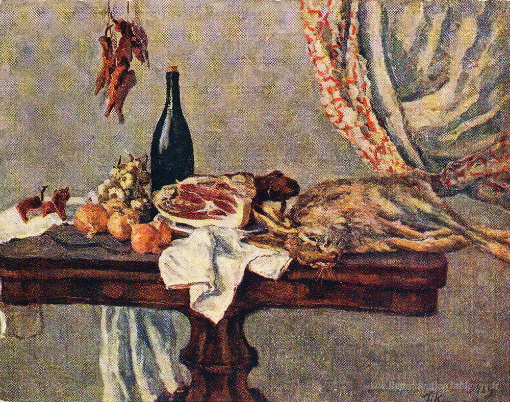 Nous vous proposons une reproduction artisanale sur toile du célèbre tableau 'Nature morte avec lapin' de Pyotr Konchalovsky, provenant du Musée de la Reproduction.
