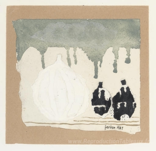 Nous vous proposons une reproduction artisanale sur toile du célèbre tableau 'Nature morte avec les oignons' de Mary Fedden, provenant du Musée de la Reproduction.