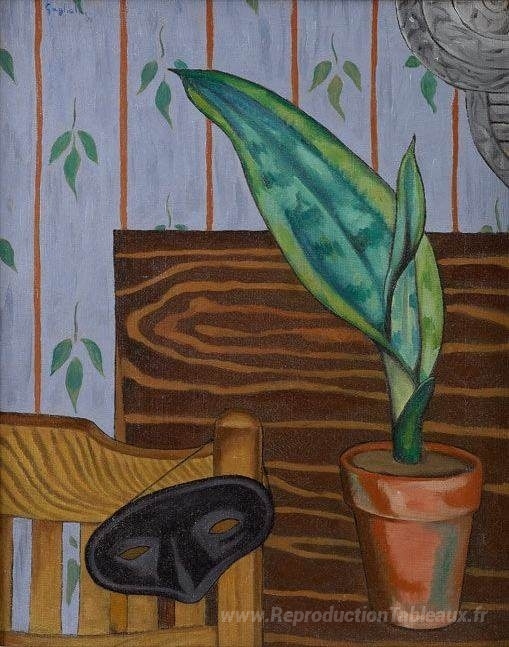 Nous vous proposons une reproduction artisanale sur toile du célèbre tableau 'Nature morte avec masque' de O. Louis Guglielmi, provenant du Musée de la Reproduction.