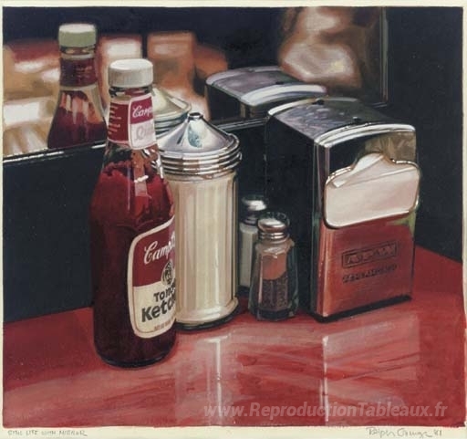 Nous vous proposons une reproduction artisanale sur toile du célèbre tableau 'Nature morte avec miroir' de Ralph Goings, provenant du Musée de la Reproduction.