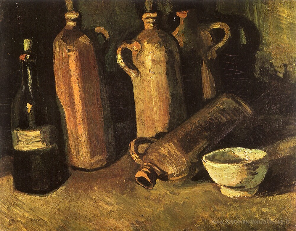 Nous vous proposons une reproduction artisanale sur toile du célèbre tableau 'Nature morte avec quatre bouteilles en pierre, flacon et tasse b' de Vincent van Gogh, provenant du Musée de la Reproduction.