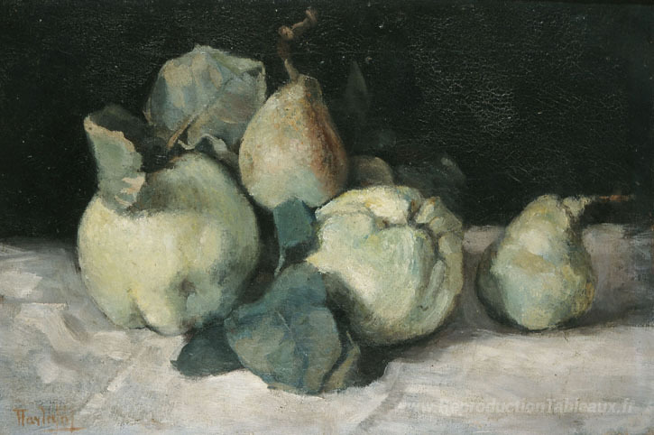 Nous vous proposons une reproduction artisanale sur toile du célèbre tableau 'Nature morte avec quincs' de Pericles Pantazis , provenant du Musée de la Reproduction.