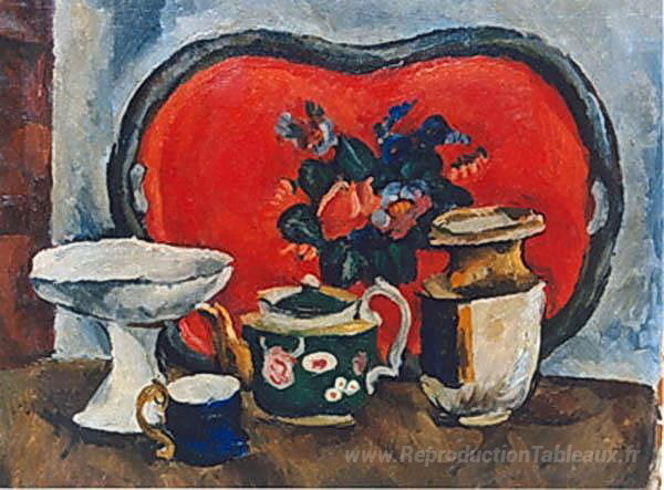 Nous vous proposons une reproduction artisanale sur toile du célèbre tableau 'Nature morte avec un plateau rouge.' de Pyotr Konchalovsky, provenant du Musée de la Reproduction.