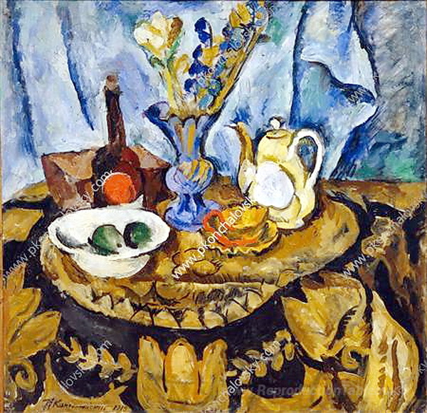 Nous vous proposons une reproduction artisanale sur toile du célèbre tableau 'Nature morte avec une cateille' de Pyotr Konchalovsky, provenant du Musée de la Reproduction.