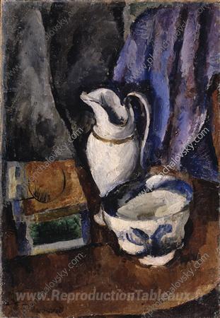 Nous vous proposons une reproduction artisanale sur toile du célèbre tableau 'Nature morte avec une cruche' de Pyotr Konchalovsky, provenant du Musée de la Reproduction.