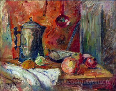 Nous vous proposons une reproduction artisanale sur toile du célèbre tableau 'Nature morte avec une cruche' de David Burliuk, provenant du Musée de la Reproduction.