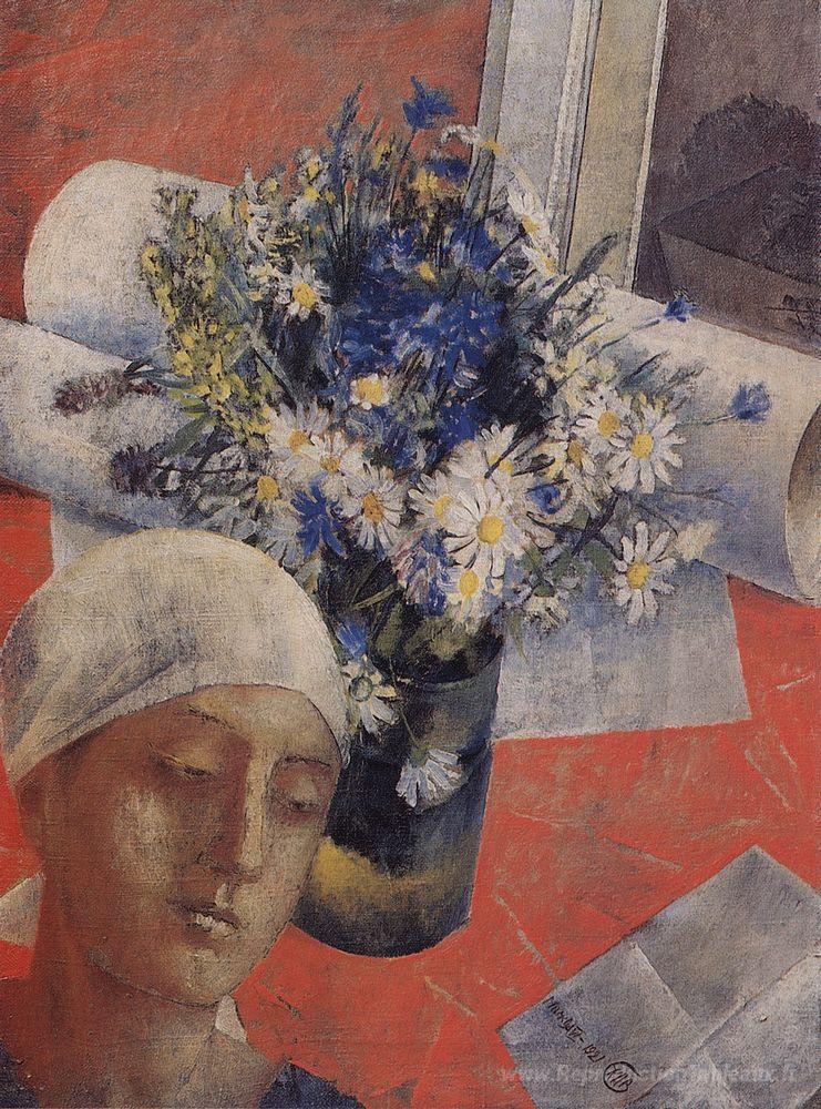 Nous vous proposons une reproduction artisanale sur toile du célèbre tableau 'Nature morte (avec une tête féminine)' de Kuzma Petrov-Vodkin, provenant du Musée de la Reproduction.