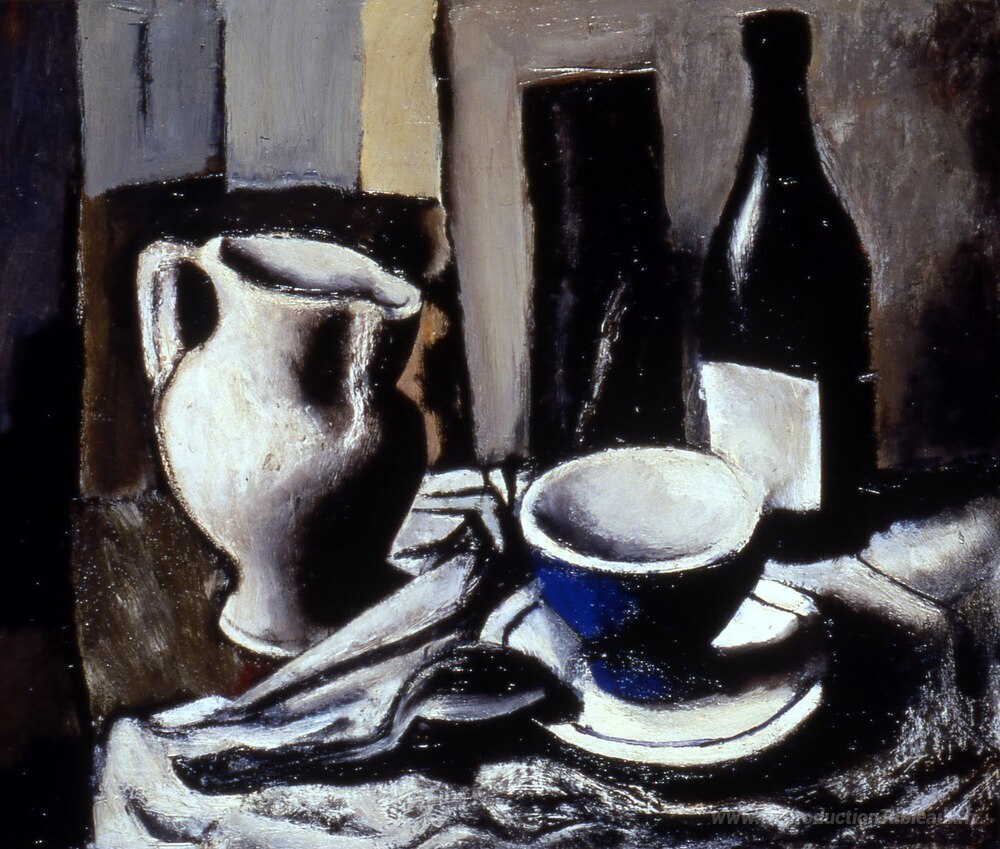 Nous vous proposons une reproduction artisanale sur toile du célèbre tableau 'Nature morte avec une tasse bleue' de Mario Sironi, provenant du Musée de la Reproduction.
