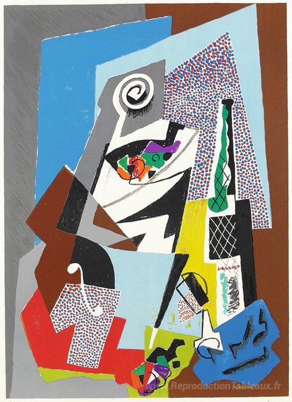 Nous vous proposons une reproduction artisanale sur toile du célèbre tableau 'Nature morte avec violon' de Gino Severini, provenant du Musée de la Reproduction.