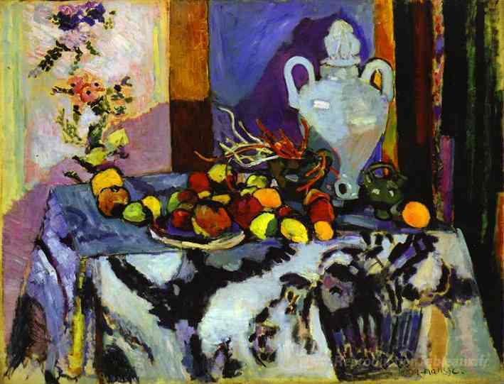 Nous vous proposons une reproduction artisanale sur toile du célèbre tableau 'Nature morte bleue' de Henri Matisse, provenant du Musée de la Reproduction.