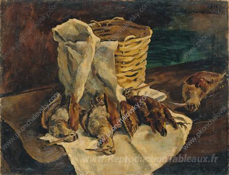 Nous vous proposons une reproduction artisanale sur toile du célèbre tableau 'Nature morte. Bois avec un panier.' de Pyotr Konchalovsky, provenant du Musée de la Reproduction.