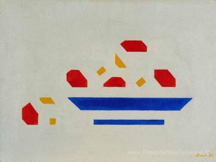Nous vous proposons une reproduction artisanale sur toile du célèbre tableau 'Nature morte (bol avec des pommes)' de Bart van der Leck, provenant du Musée de la Reproduction.