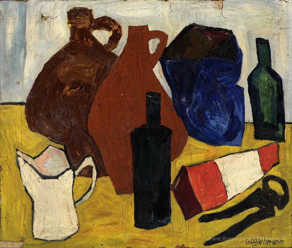 Nous vous proposons une reproduction artisanale sur toile du célèbre tableau 'Nature morte - bouteilles, cruches, lanceur' de William H. Johnson, provenant du Musée de la Reproduction.