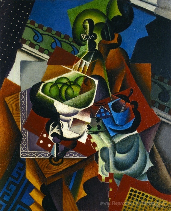 Nous vous proposons une reproduction artisanale sur toile du célèbre tableau 'Nature morte, cartes à jouer, tasse de café et pommes' de Jean Metzinger, provenant du Musée de la Reproduction.