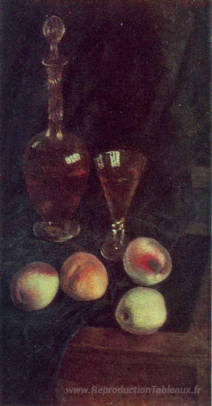 Nous vous proposons une reproduction artisanale sur toile du célèbre tableau 'Nature morte. Décanteur et pêches' de Ilya Mashkov, provenant du Musée de la Reproduction.