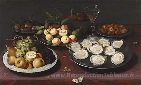 Nous vous proposons une reproduction artisanale sur toile du célèbre tableau 'Nature morte de fruits et une assiette d'huîtres' de Osias Beert, provenant du Musée de la Reproduction.