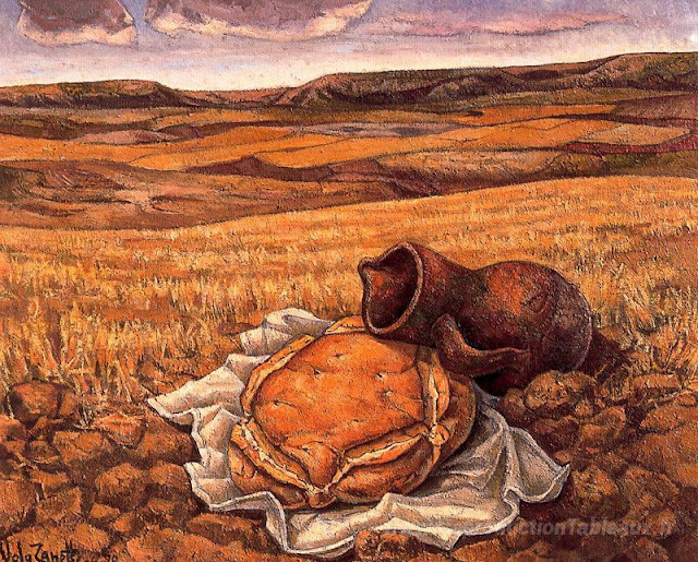 Nous vous proposons une reproduction artisanale sur toile du célèbre tableau 'Nature morte de la terre' de Vela Zanetti, provenant du Musée de la Reproduction.
