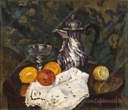 Nous vous proposons une reproduction artisanale sur toile du célèbre tableau 'Nature morte en arrière-plan du tapis. Oranges et café.' de Pyotr Konchalovsky, provenant du Musée de la Reproduction.