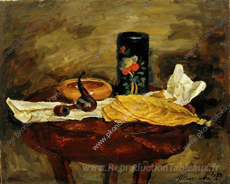 Nous vous proposons une reproduction artisanale sur toile du célèbre tableau 'Nature morte. Feuilles de tabac et caddie au thé noir.' de Pyotr Konchalovsky, provenant du Musée de la Reproduction.