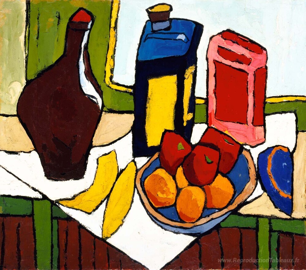 Nous vous proposons une reproduction artisanale sur toile du célèbre tableau 'Nature morte - Fruit, bouteilles' de William H. Johnson, provenant du Musée de la Reproduction.