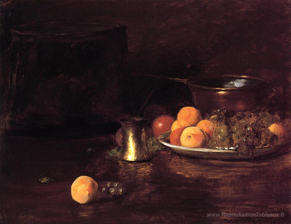 Nous vous proposons une reproduction artisanale sur toile du célèbre tableau 'Nature morte - Fruit' de William Merritt Chase, provenant du Musée de la Reproduction.