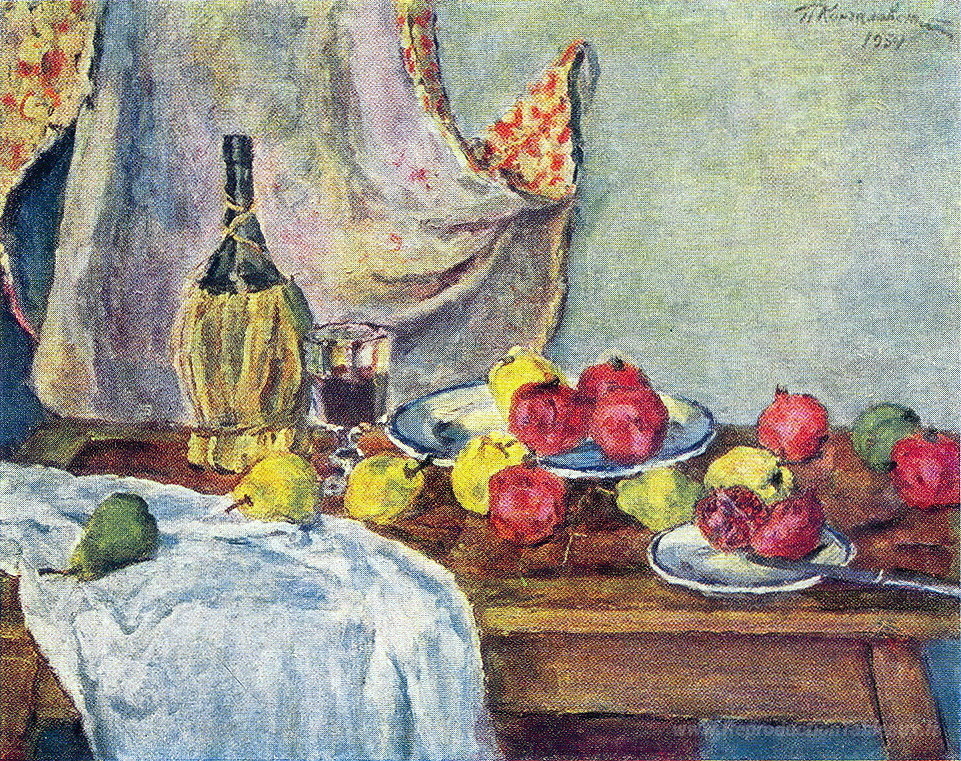 Nous vous proposons une reproduction artisanale sur toile du célèbre tableau 'Nature morte. Grenades.' de Pyotr Konchalovsky, provenant du Musée de la Reproduction.