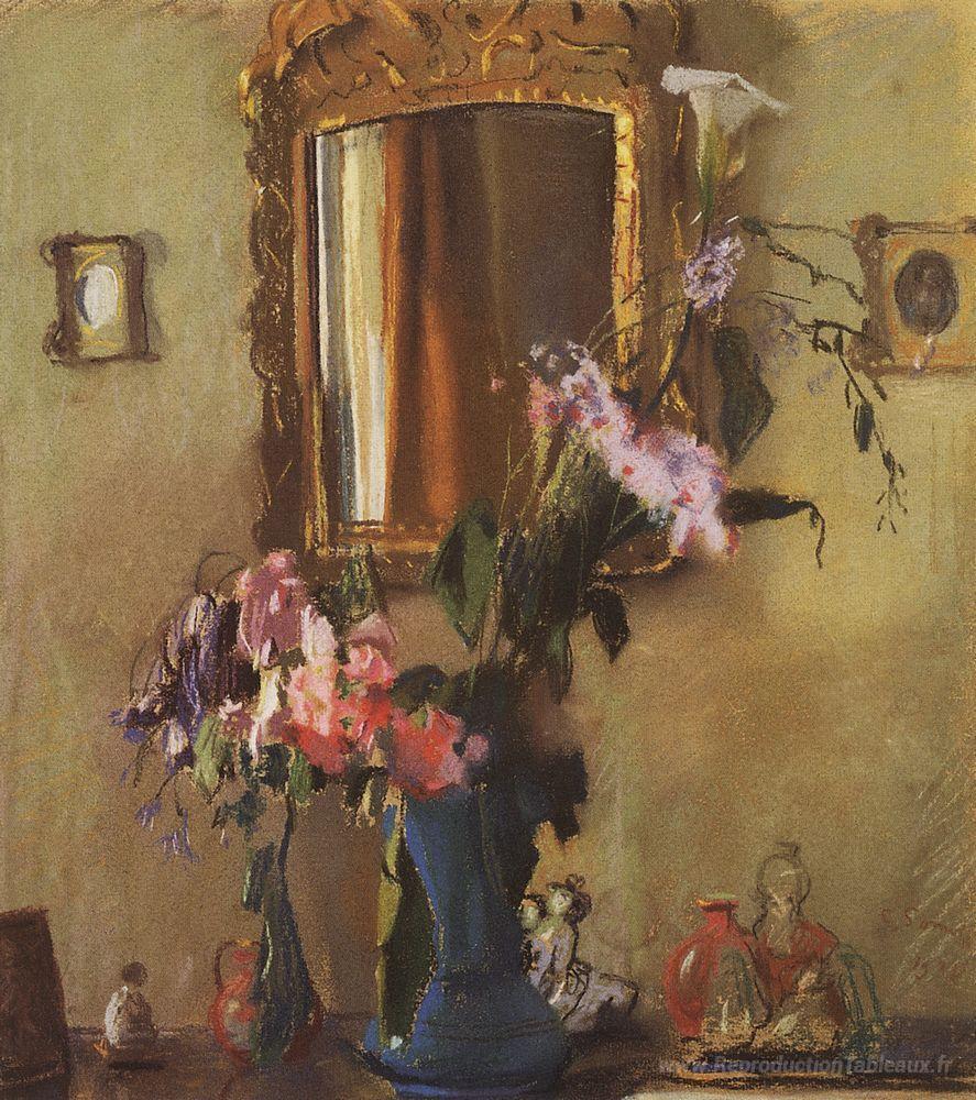 Nous vous proposons une reproduction artisanale sur toile du célèbre tableau 'Nature morte. Intérieur' de Konstantin Somov, provenant du Musée de la Reproduction.