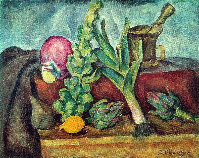 Nous vous proposons une reproduction artisanale sur toile du célèbre tableau 'Nature morte. Légumes.' de Pyotr Konchalovsky, provenant du Musée de la Reproduction.