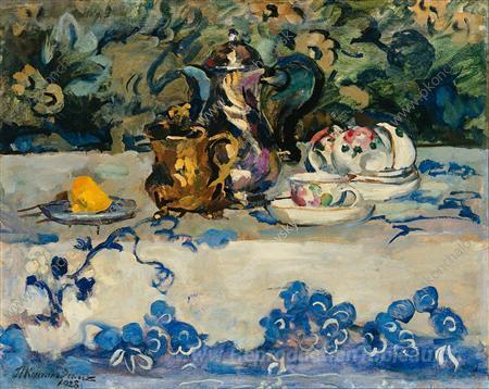 Nous vous proposons une reproduction artisanale sur toile du célèbre tableau 'Nature morte. Or et argent en tissu japonais.' de Pyotr Konchalovsky, provenant du Musée de la Reproduction.