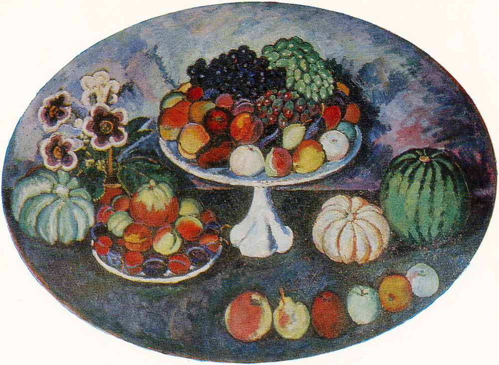 Nous vous proposons une reproduction artisanale sur toile du célèbre tableau 'Nature morte ovale avec vase blanc et fruits' de Ilya Mashkov, provenant du Musée de la Reproduction.