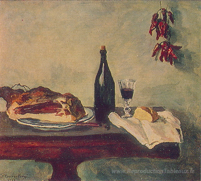 Nous vous proposons une reproduction artisanale sur toile du célèbre tableau 'Nature morte. Pain, jambon et vin.' de Pyotr Konchalovsky, provenant du Musée de la Reproduction.
