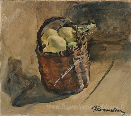 Nous vous proposons une reproduction artisanale sur toile du célèbre tableau 'Nature morte. Panier de pommes sur le sol.' de Pyotr Konchalovsky, provenant du Musée de la Reproduction.