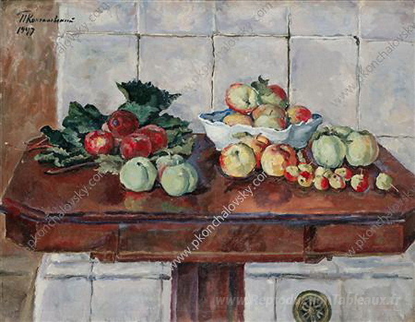 Nous vous proposons une reproduction artisanale sur toile du célèbre tableau 'Nature morte. Pommes sur une table près du poêle.' de Pyotr Konchalovsky, provenant du Musée de la Reproduction.