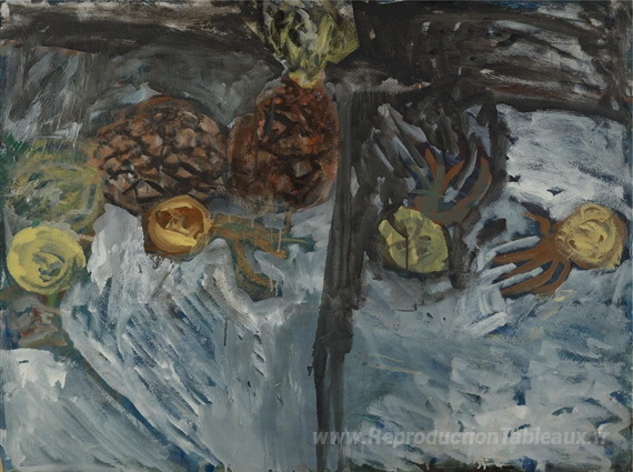 Nous vous proposons une reproduction artisanale sur toile du célèbre tableau 'Oignons et ananas' de Gandy Brodie, provenant du Musée de la Reproduction.