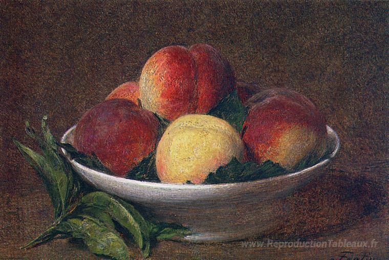 Nous vous proposons une reproduction artisanale sur toile du célèbre tableau 'Pêches dans un bol' de Henri Fantin-Latour, provenant du Musée de la Reproduction.