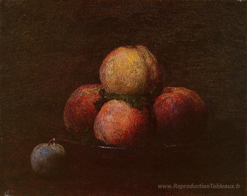 Nous vous proposons une reproduction artisanale sur toile du célèbre tableau 'Pêches et une prune' de Henri Fantin-Latour, provenant du Musée de la Reproduction.