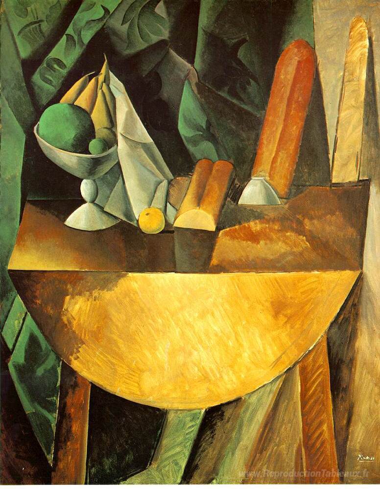 Nous vous proposons une reproduction artisanale sur toile du célèbre tableau 'Pain et plat avec des fruits sur la table' de Pablo Picasso, provenant du Musée de la Reproduction.