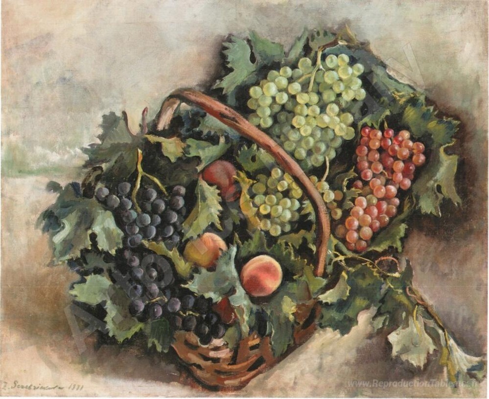 Nous vous proposons une reproduction artisanale sur toile du célèbre tableau 'Panier avec des raisins et des pêches' de Zinaida Serebriakova, provenant du Musée de la Reproduction.