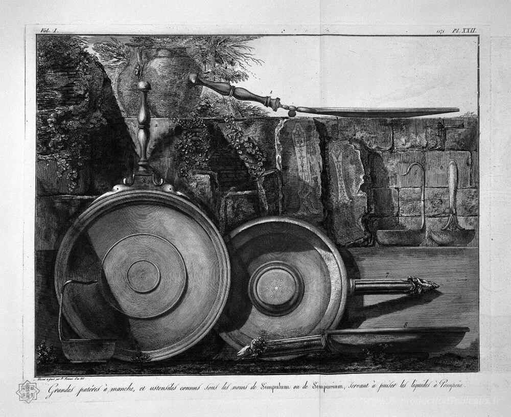 Nous vous proposons une reproduction artisanale sur toile du célèbre tableau 'Paterae, et ustensiles avec une poignée pour dessiner de l'eau, ' de Giovanni Battista Piranesi, provenant du Musée de la Reproduction.