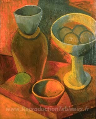 Nous vous proposons une reproduction artisanale sur toile du célèbre tableau 'Perche et plat de fruits' de Pablo Picasso, provenant du Musée de la Reproduction.