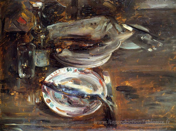 Nous vous proposons une reproduction artisanale sur toile du célèbre tableau 'Petit-déjeuner de chat' de Lovis Corinth, provenant du Musée de la Reproduction.