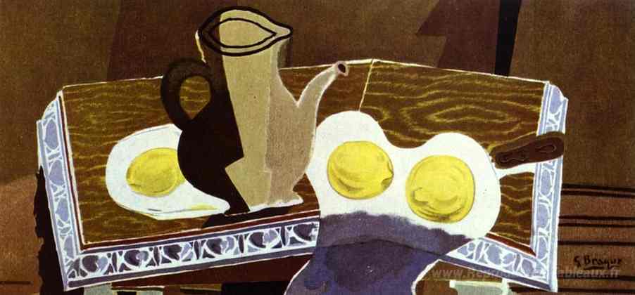 Nous vous proposons une reproduction artisanale sur toile du célèbre tableau 'Pichet en verre et citrons' de Georges Braque, provenant du Musée de la Reproduction.