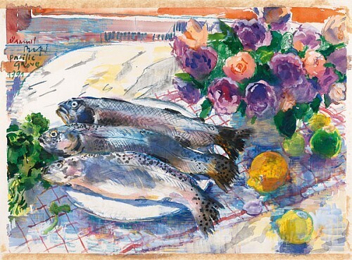 Nous vous proposons une reproduction artisanale sur toile du célèbre tableau 'Poisson, fleurs et fruits' de Samuel Buri, provenant du Musée de la Reproduction.