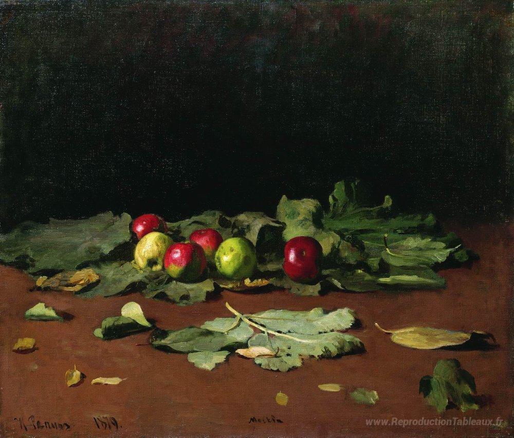 Nous vous proposons une reproduction artisanale sur toile du célèbre tableau 'Pommes et feuilles' de Ilya Repin, provenant du Musée de la Reproduction.